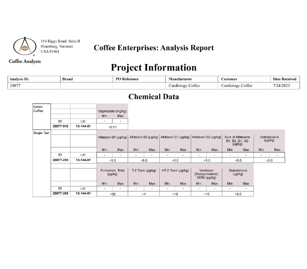 Recent lab tests confirm that our coffee is free from harmful substances, including glyphosate (a common weed killer) and a range of mycotoxins, like aflatoxins and ochratoxin A. These toxins can sometimes be found in low-quality coffees, but our rigorous testing ensures they’re not in Cardiology Coffee.